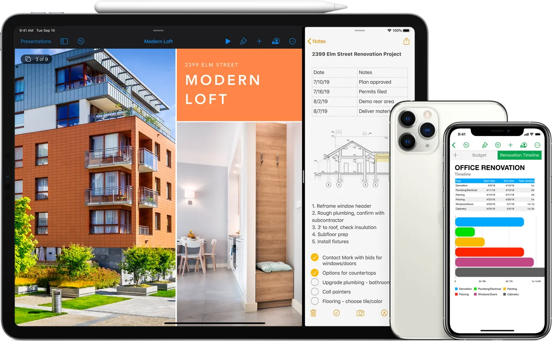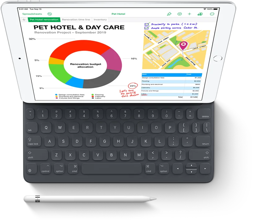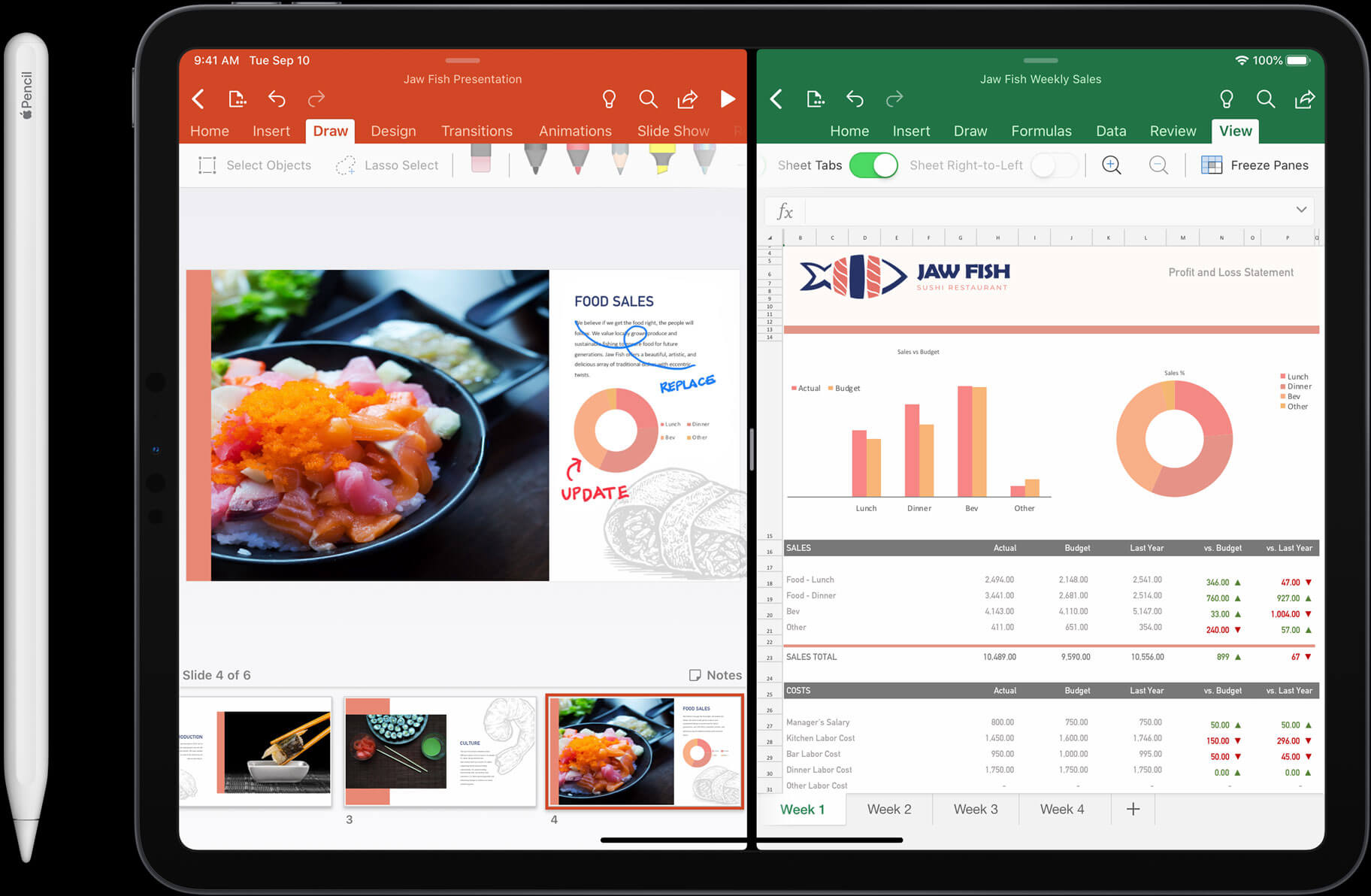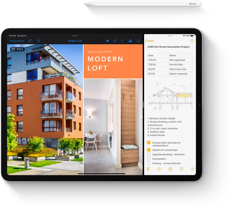 Skatiet vienlaikus datu lapas un slaidus, izmantojot sadalīto ekrānu, un radiet maģiju ar Apple Pencil.