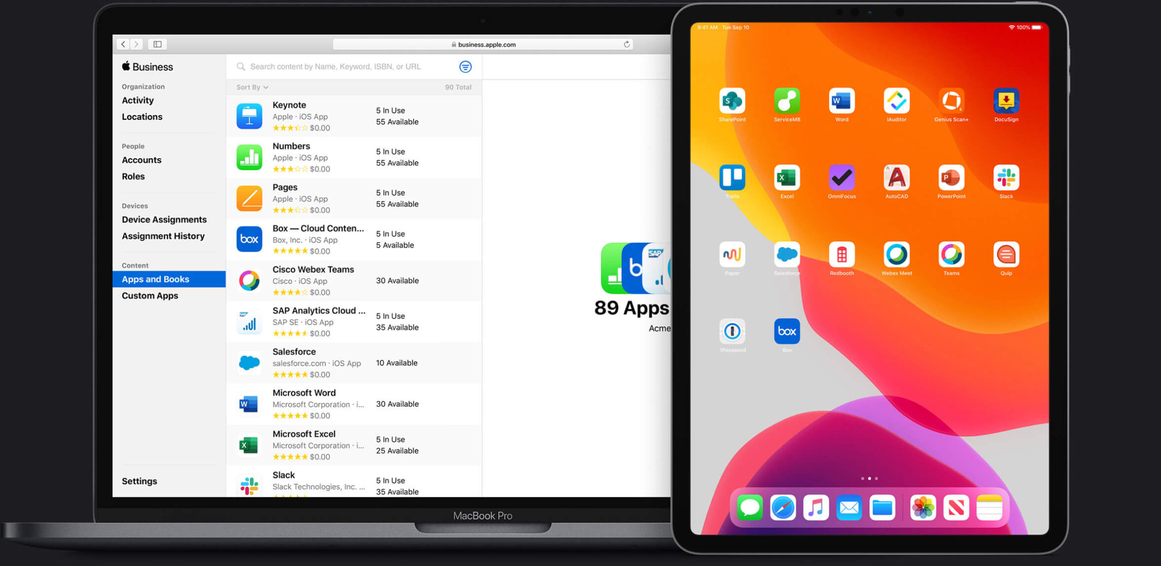 Lietotnes, kas iegādātas, izmantojot Apple Biznesa pārvaldnieku, var viegli nogādāt lietotājiem un ierīcēm jebkurā valstī, kur lietotne ir pieejama, izmantojot MDM risinājumu. Izmantojot MDM risinājumu, jūs varat privāti un droši nogādāt saturu konkrētiem partneriem, klientiem vai franšīzes turētājiem. Tāpat uzņēmuma darbiniekiem varat nodot patentētās lietotnes.